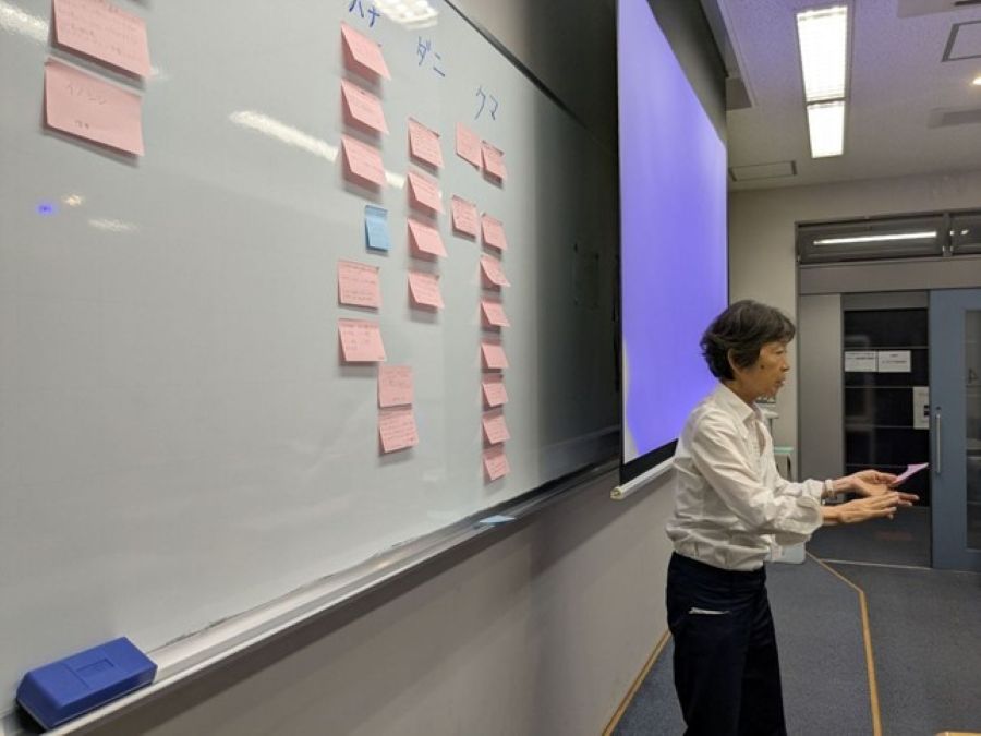 集会では、まず付箋を使って参加者の経験や情報を書いてもらい、それを読み上げて全員で共有した。写真はその内容を紹介しているところ。ホワイトボード上に挙げられた主な分類群(件数)は、左からイノシシ(3)、カラス(0)、ハチ(8)、ダニ(6)、クマ(10)。2群以上にまたがる場合もあった。