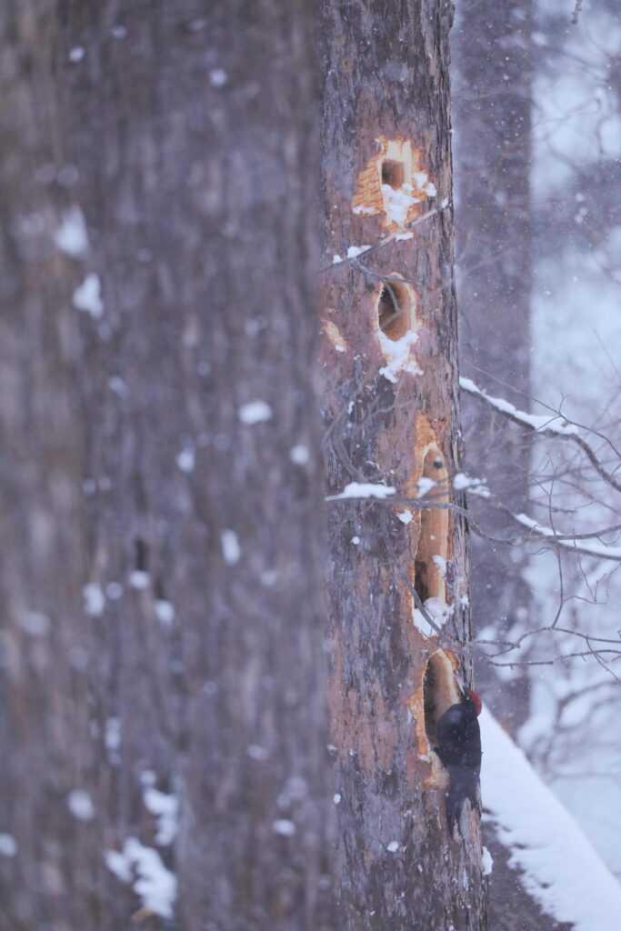 日本で唯一の大型キツツキ類であるクマゲラは、本州では幻の鳥として存続が危ぶまれていますが、北海道では広く見られ、札幌のような大都市であっても、その近郊の野幌森林公園などでは観察できる比較的ポピュラーな鳥です。本論文の著者である猿舘さんたちは、札幌のクマゲラの冬期における採餌環境を特定するため、周囲の山々13箇所、計100キロ近くを踏査し、食痕である立木に掘られた大きな穴を探す調査を行いました。