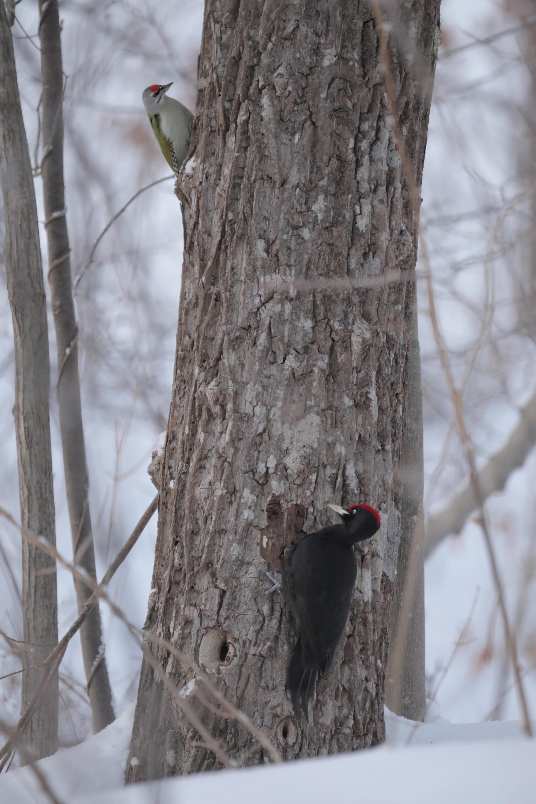 写真2 採餌中のクマゲラとそのおこぼれを狙うヤマゲラ