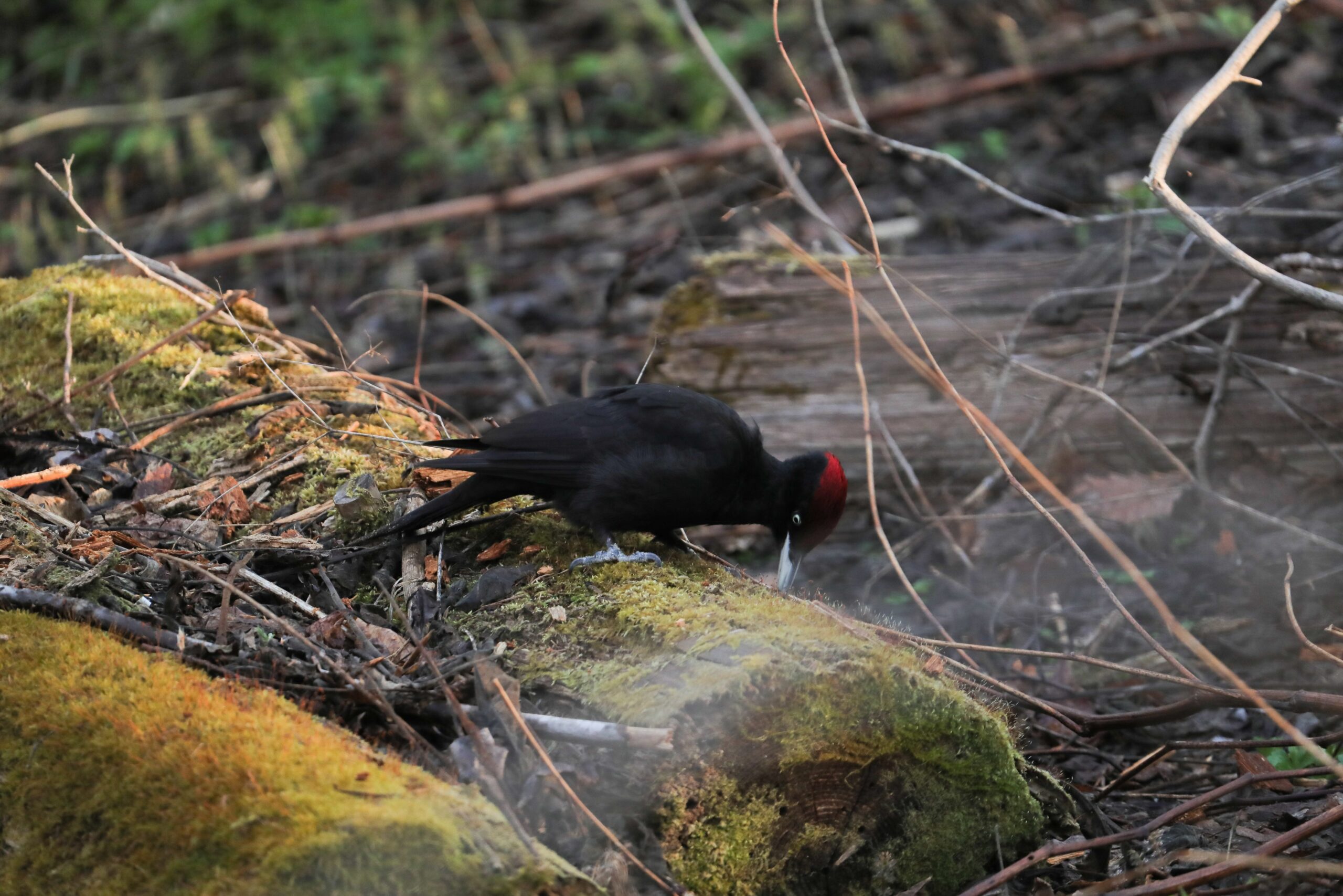 写真3 夏期に地上部の枯死木で採餌するクマゲラ