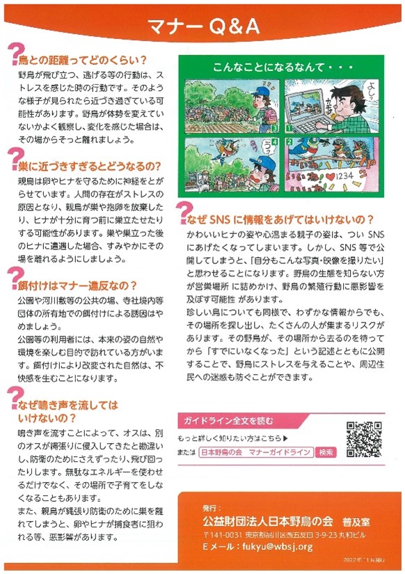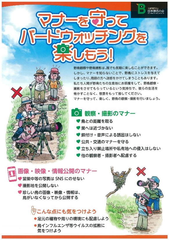 これまでに,日本野鳥の会では,①ホームページ等での撮影等のマナーの普及,②テレビ番組・新聞・写真コンテスト等でマナー違反があった場合に再発防止の要望書を送る等の再発防止等の申し入れ,③会員や一般の方から,支部の探鳥会のマナー違反や支部報でのマナー違反の報告があった場合に一般市民や各支部等に申し入れ,等の対処を実施してきました.また,「野鳥観察・撮影の初心者に向けた,マナーのガイドライン」(2022)の作成や,マナーガイドラインのパンフレット(2023)を作成し,探鳥会等で配布を実施するなどの活動をしています.